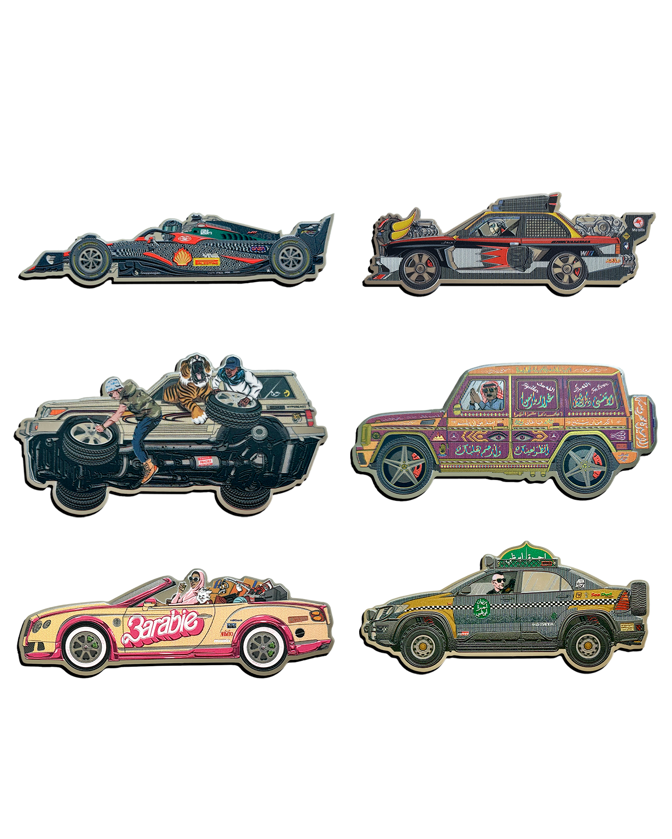 Inspired by the chaos of Middle Eastern car scenes, nostalgia collides with car culture extremism from street-mod beasts to showroom stunt cars and the grit of street iconography, and the absurdity of motorsport branding, Formula None is a parody art series that twists the concept of speed and status. Made for collectors who know the race is rigged and are building their own circuits.