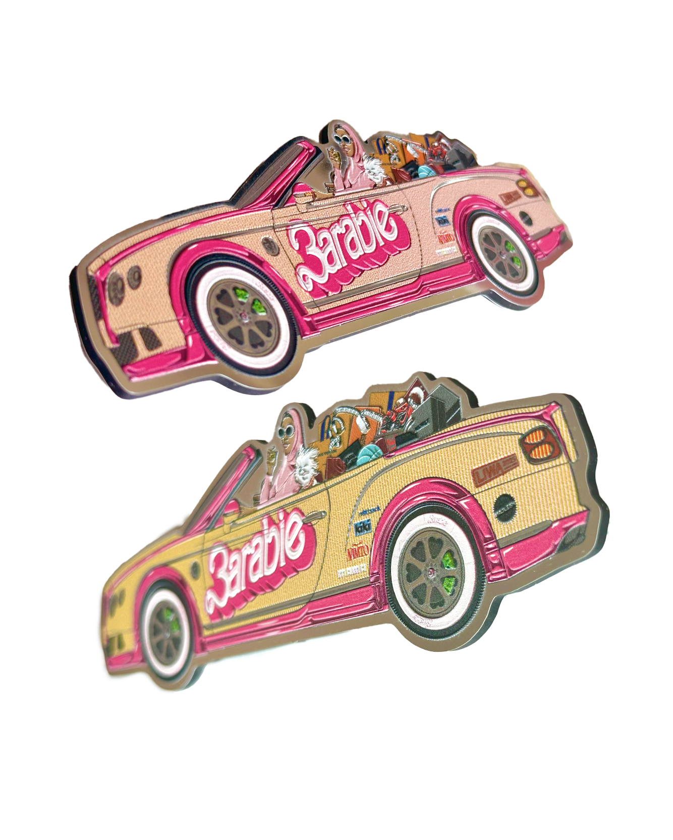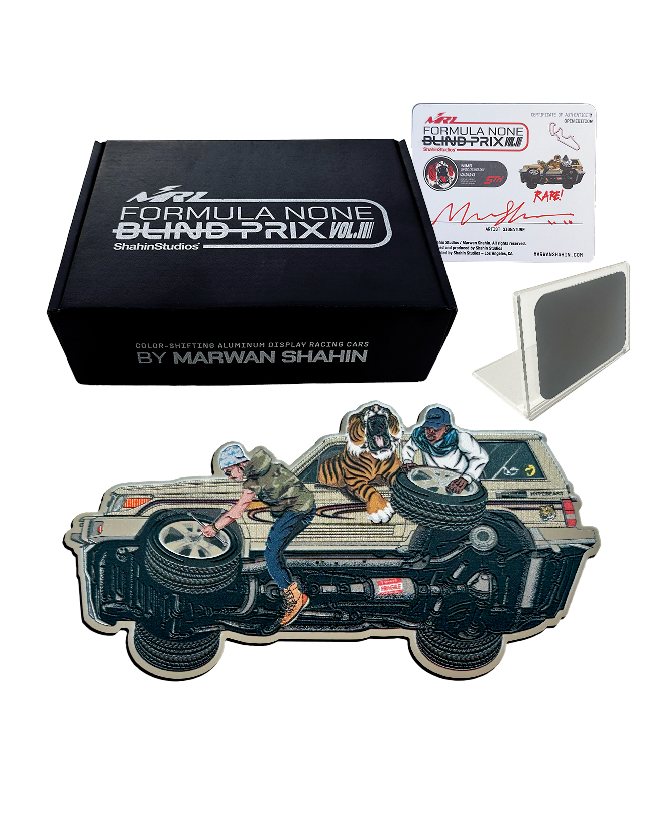 Each blind box includes one die-cut aluminum car, printed with color-shifting lenticular effects that change with every angle, then finished with 3D-printed surface detailing to give each piece the grit of a custom job.