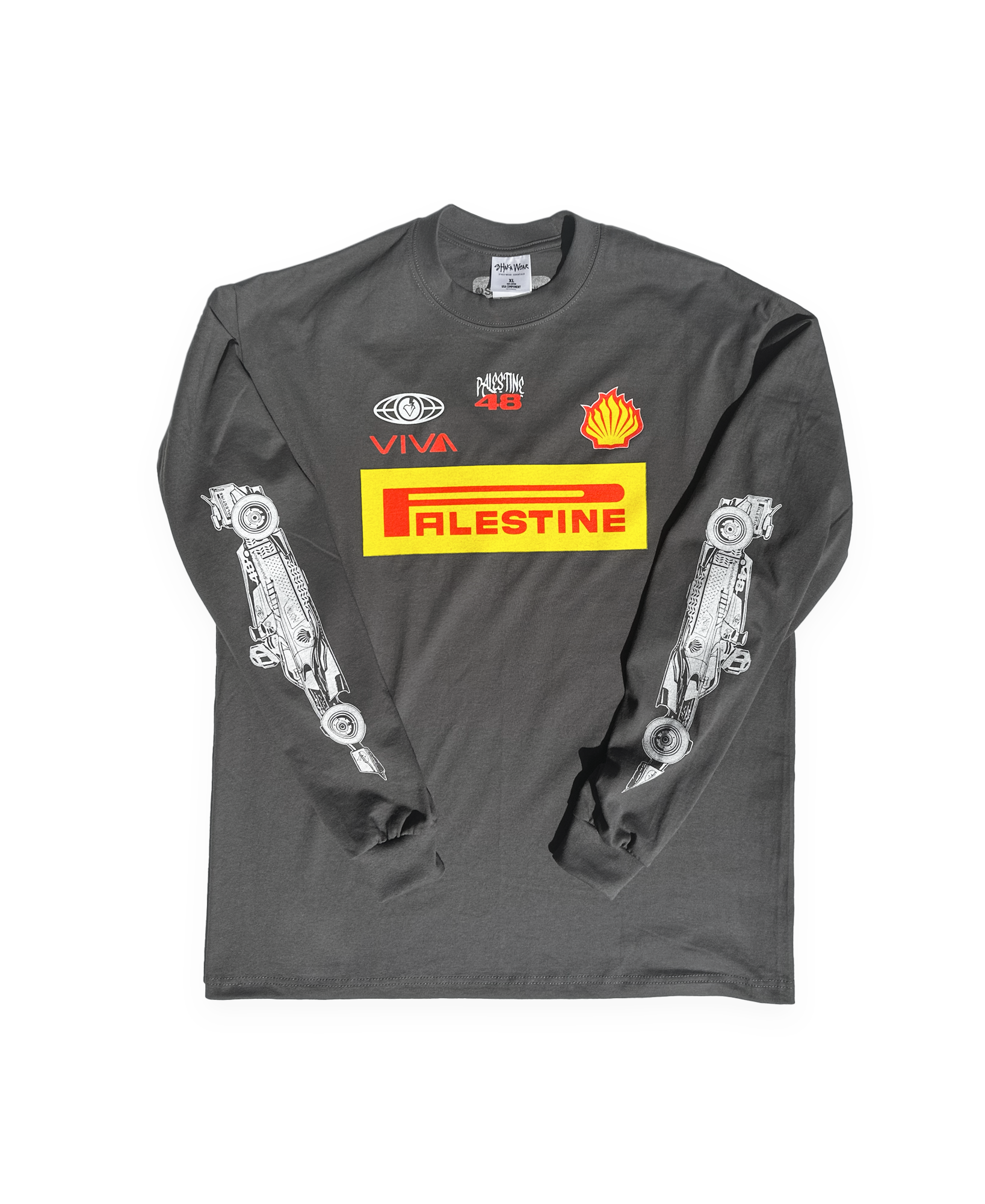 An ode to Palestine, Inspired by the aesthetics of motorsport branding and regional street iconography, this tee reclaims those symbols in tribute to the people of Gaza and all Palestinians enduring violence and displacement.