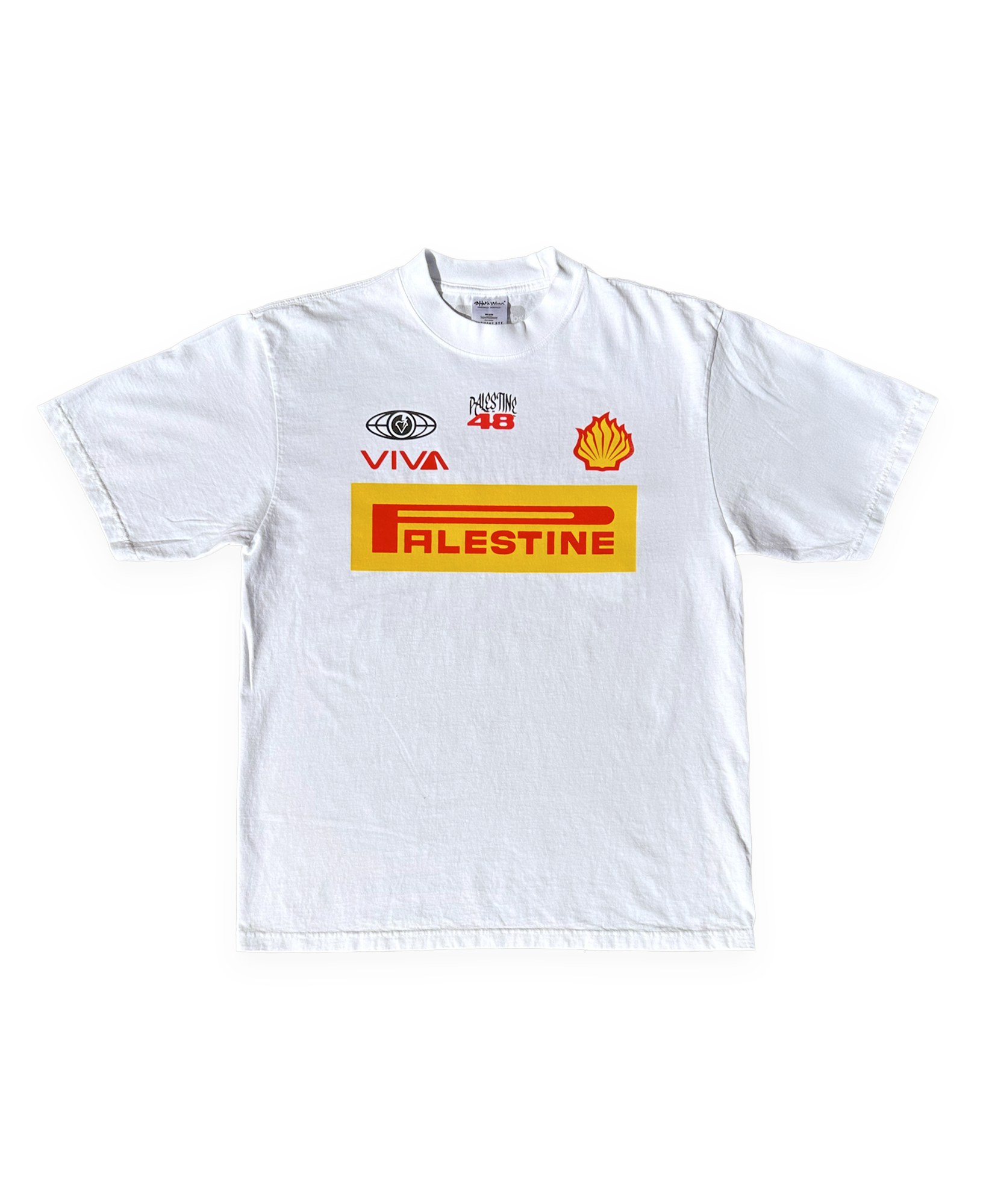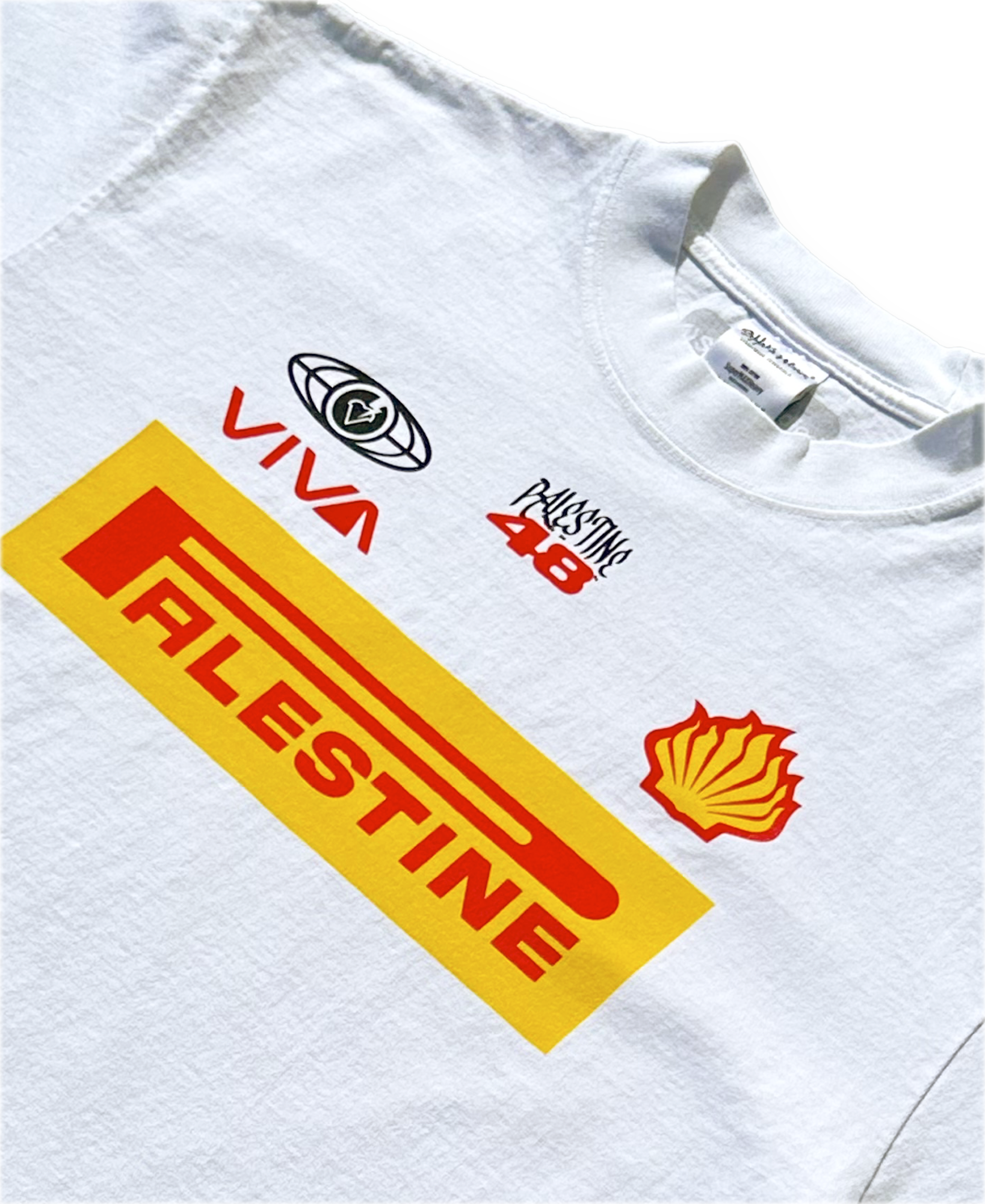 An ode to Palestine, Inspired by the aesthetics of motorsport branding and regional street iconography, this tee reclaims those symbols in tribute to the people of Gaza and all Palestinians enduring violence and displacement.
