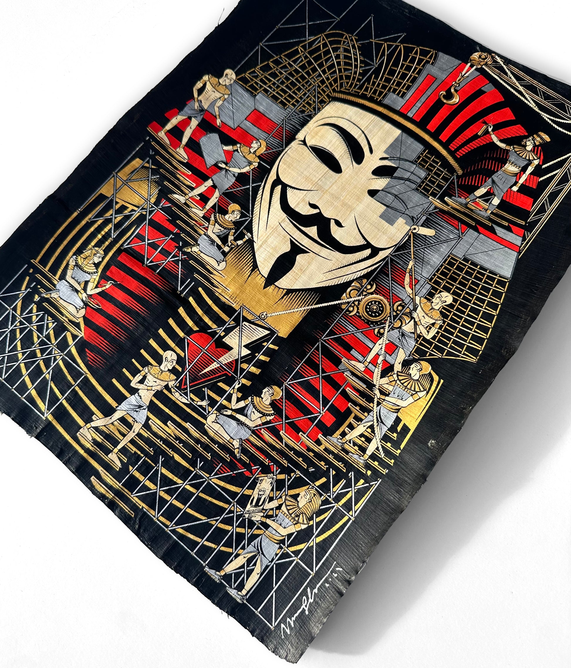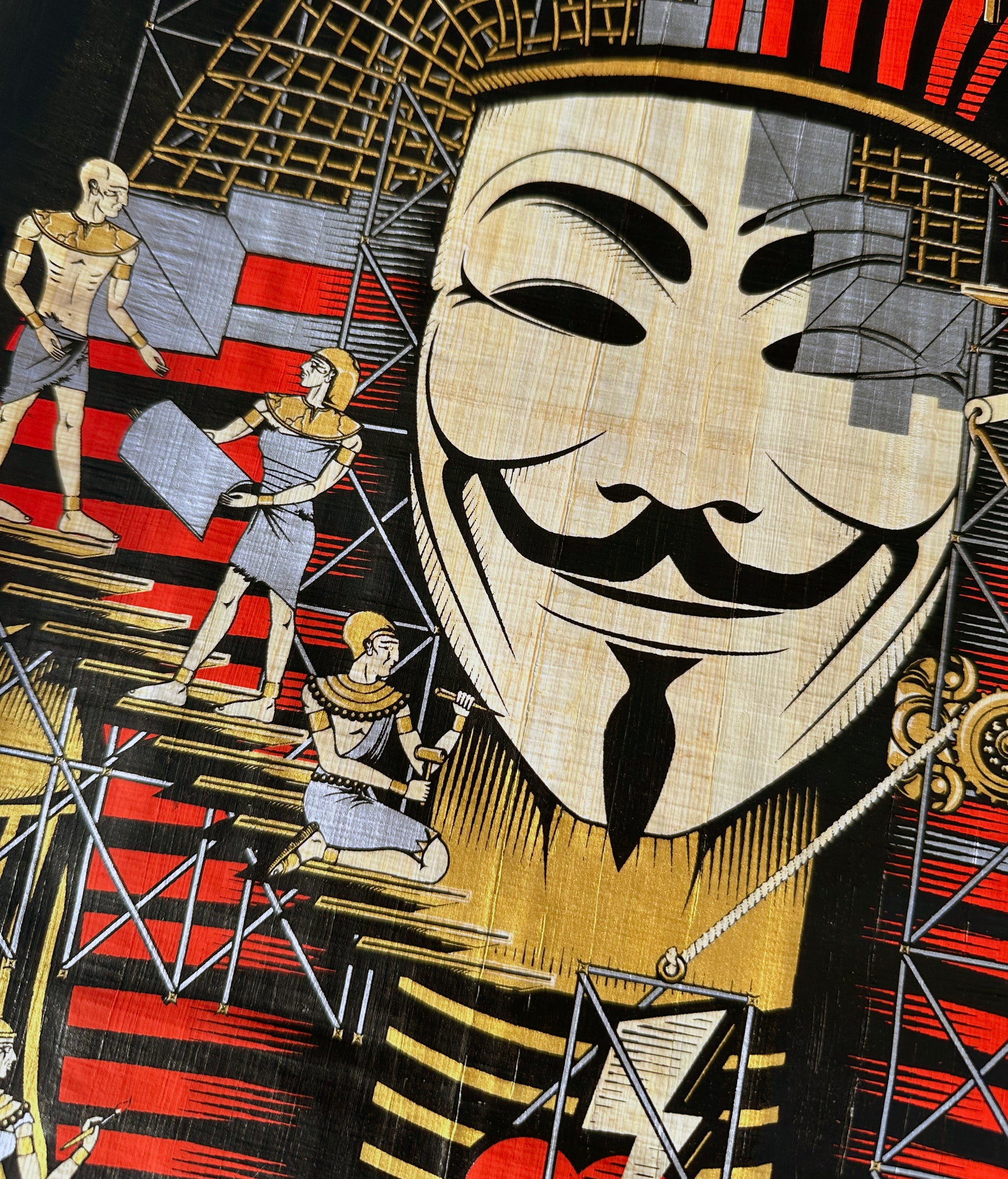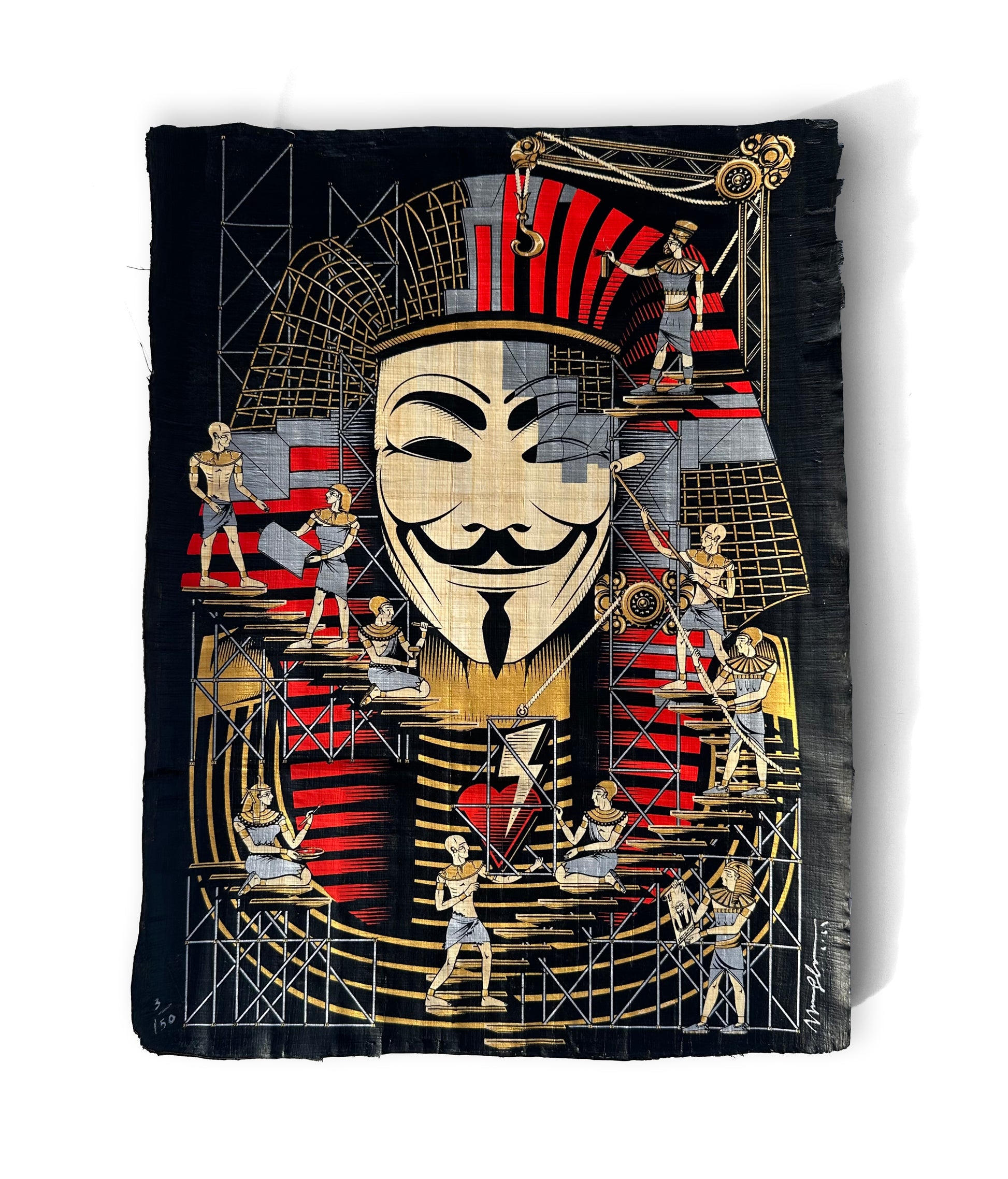 The image continues the Anonymous Pharaoh narrative, where the masked is being rebuilt by the collective voice rather than a single individual. The work suggests that revolution is not a singular moment in history, but an ongoing condition.