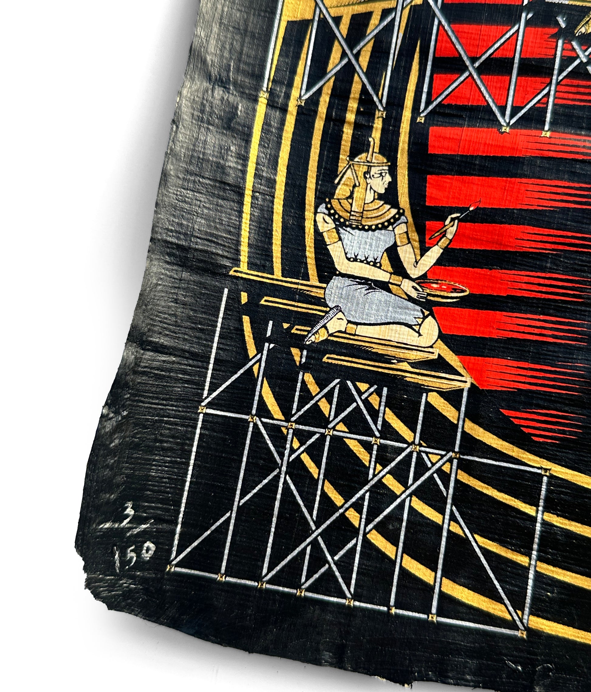 This edition is produced as a four-layer silkscreen printed on authentic Egyptian papyrus paper. The image is printed edge to edge in a deep blackout composition, allowing the natural texture of the papyrus to remain visible through the Mask.
